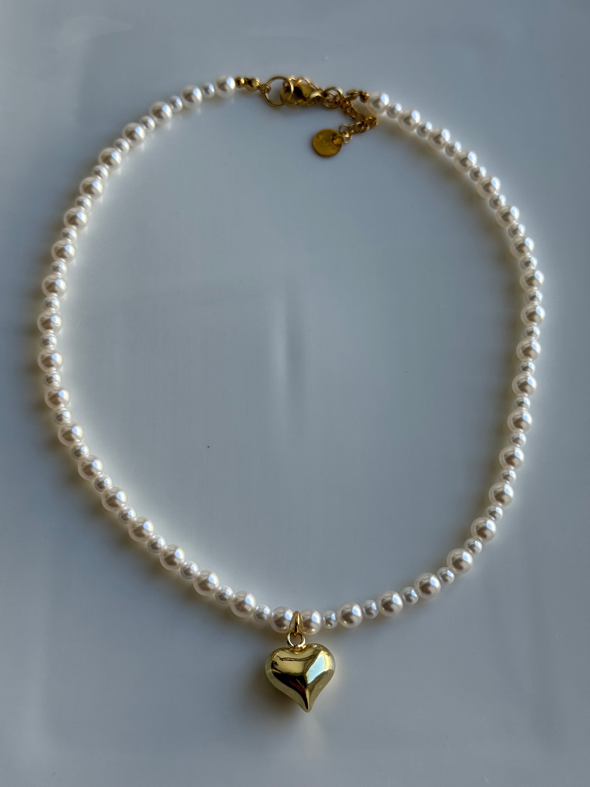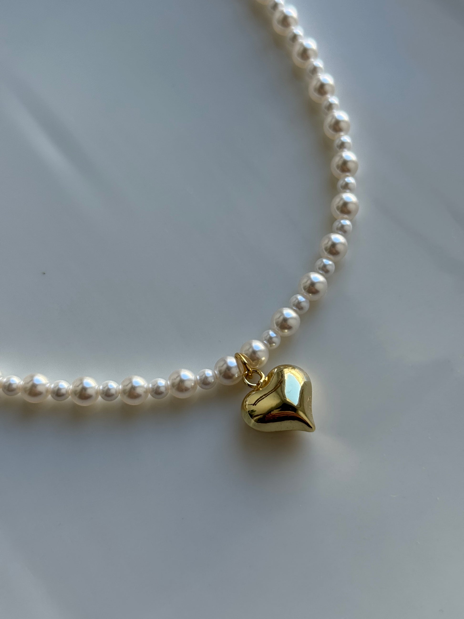 Colar de pérolas com pendente de coração dourado, uma peça delicada e elegante.