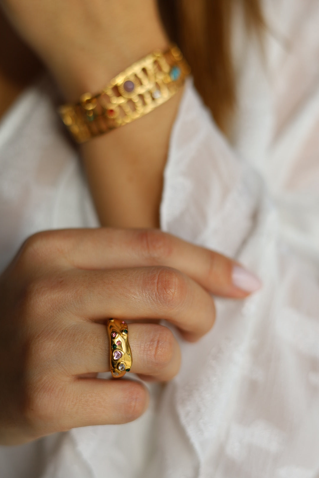Anel em aço inoxidável, com aplicação de pedras e zircônias coloridas que acrescentam brilho e cor à peça.
