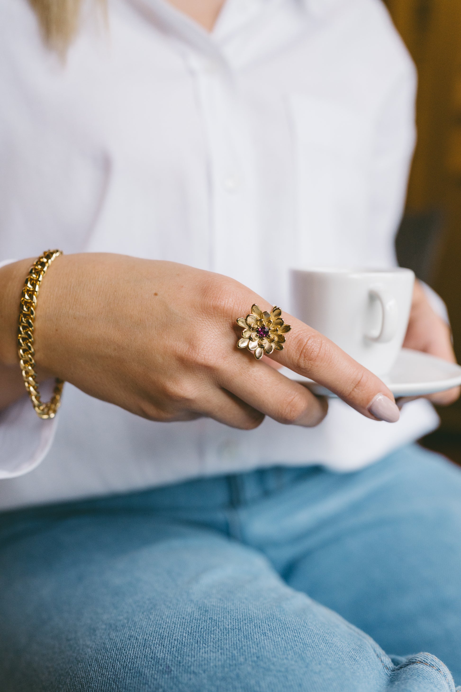 Este anel ajustável em aço, delicado em forma de flor, é uma peça elegante e moderna.