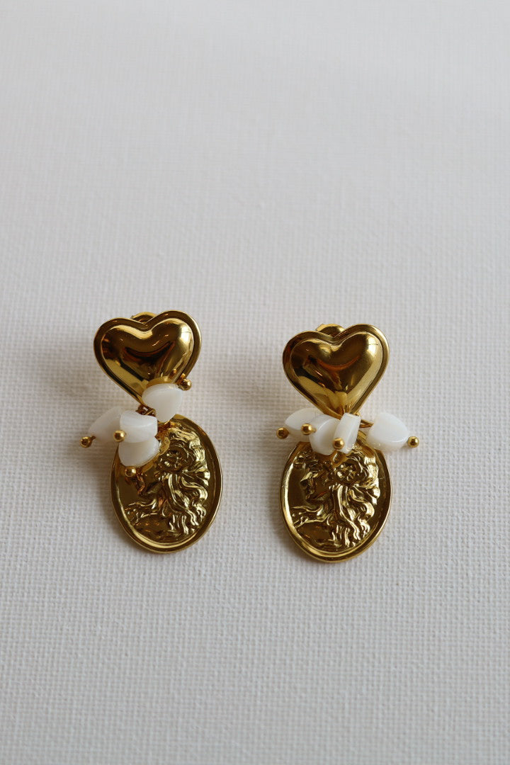 Brincos em aço inoxidável, com pendentes em mini corações de madrepérola, que trazem delicadeza e charme à peça.