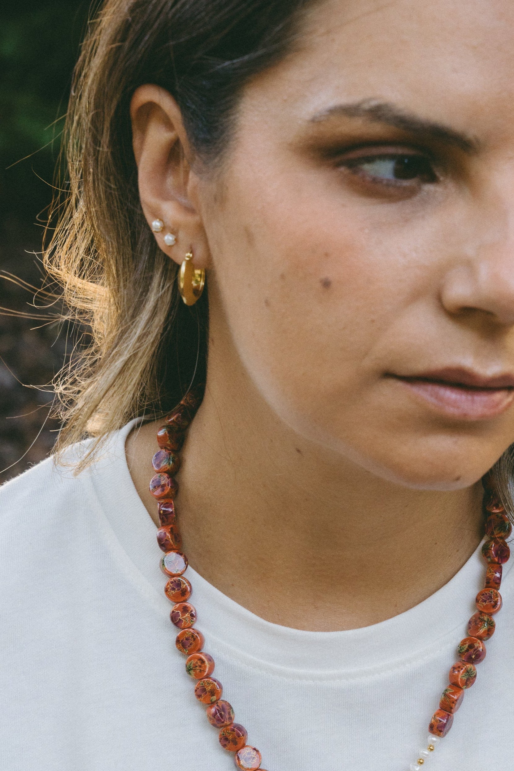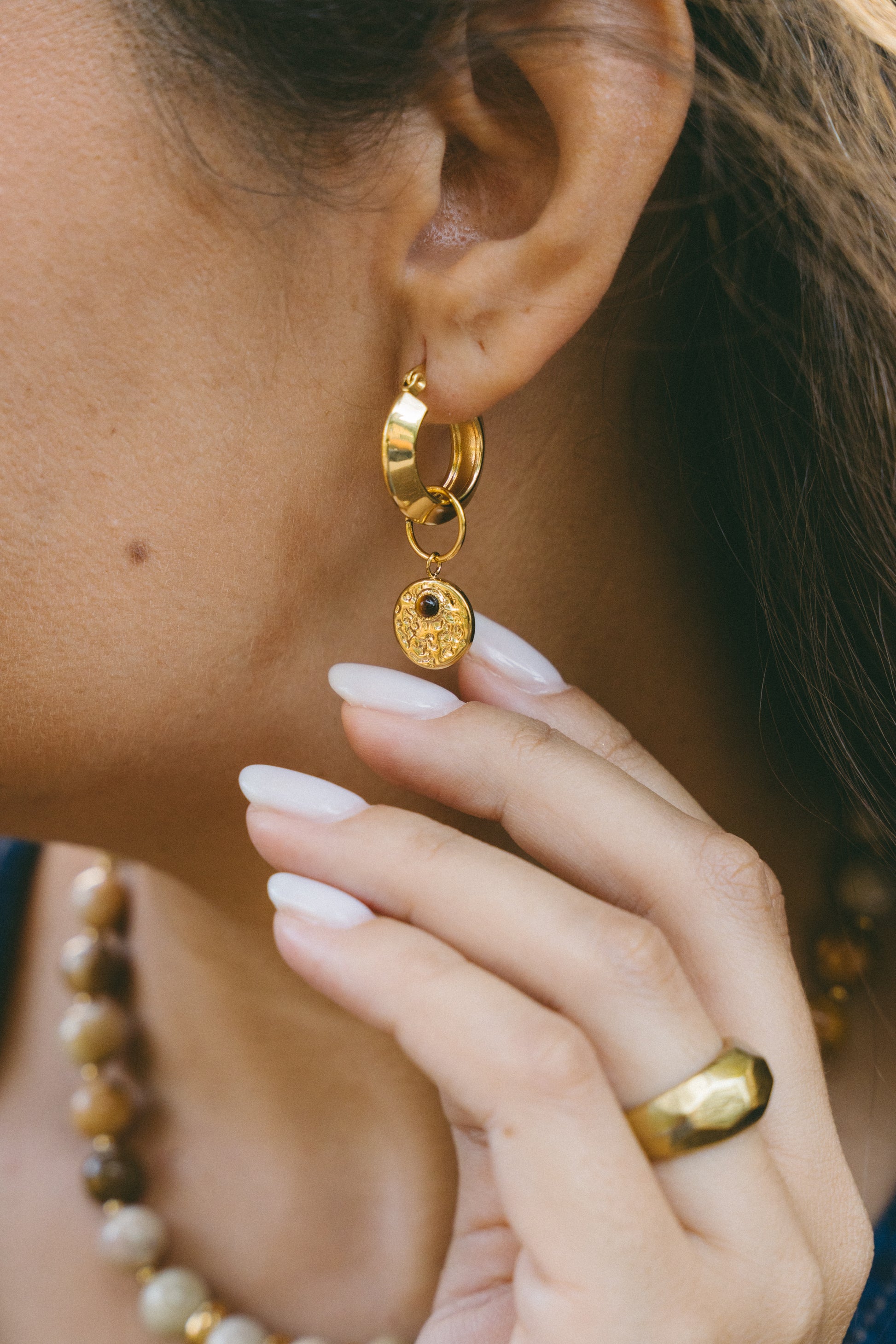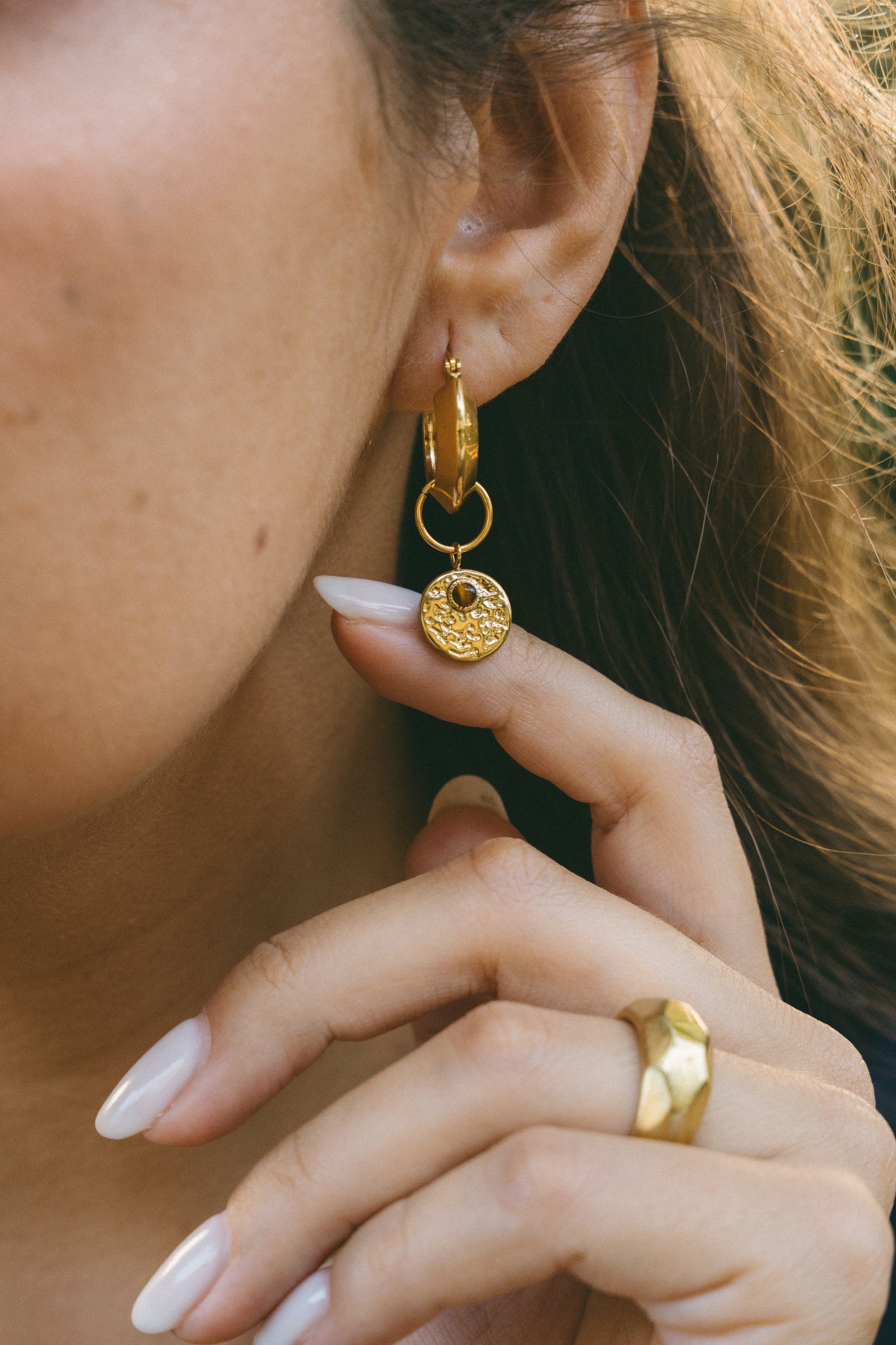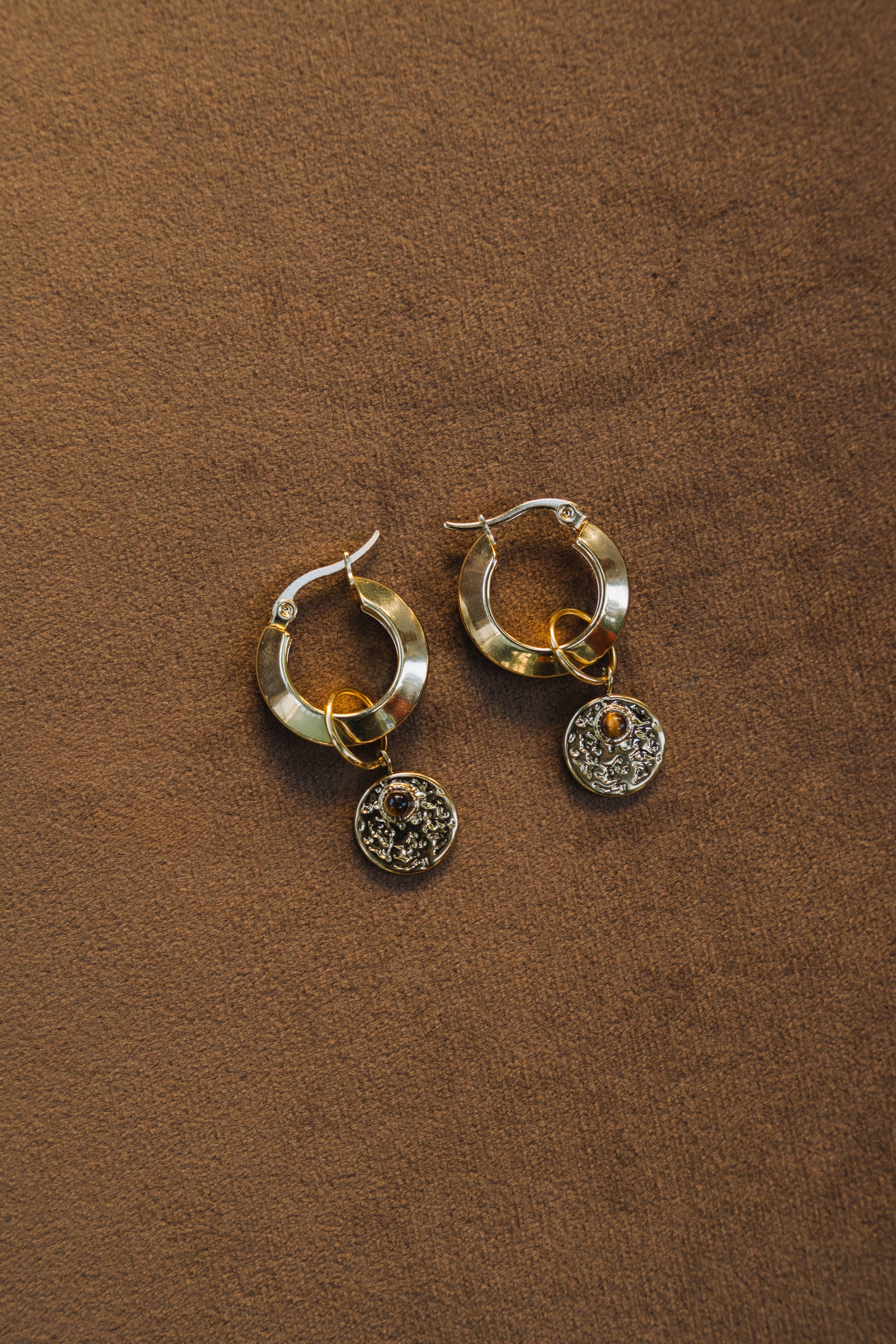 Os Brincos Raiz são argolas em aço inoxidável, com um pendente rústico removível, que permite duas formas de uso, com ou sem o pendente.