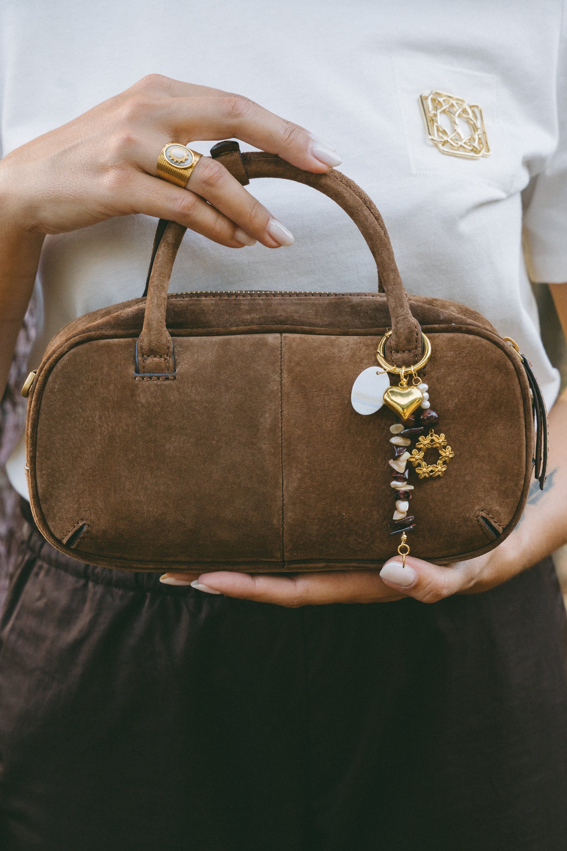 Versátil e cheio de charme, pode ser usado como acessório de mala ou porta-chaves, adaptando-se facilmente ao teu estilo.