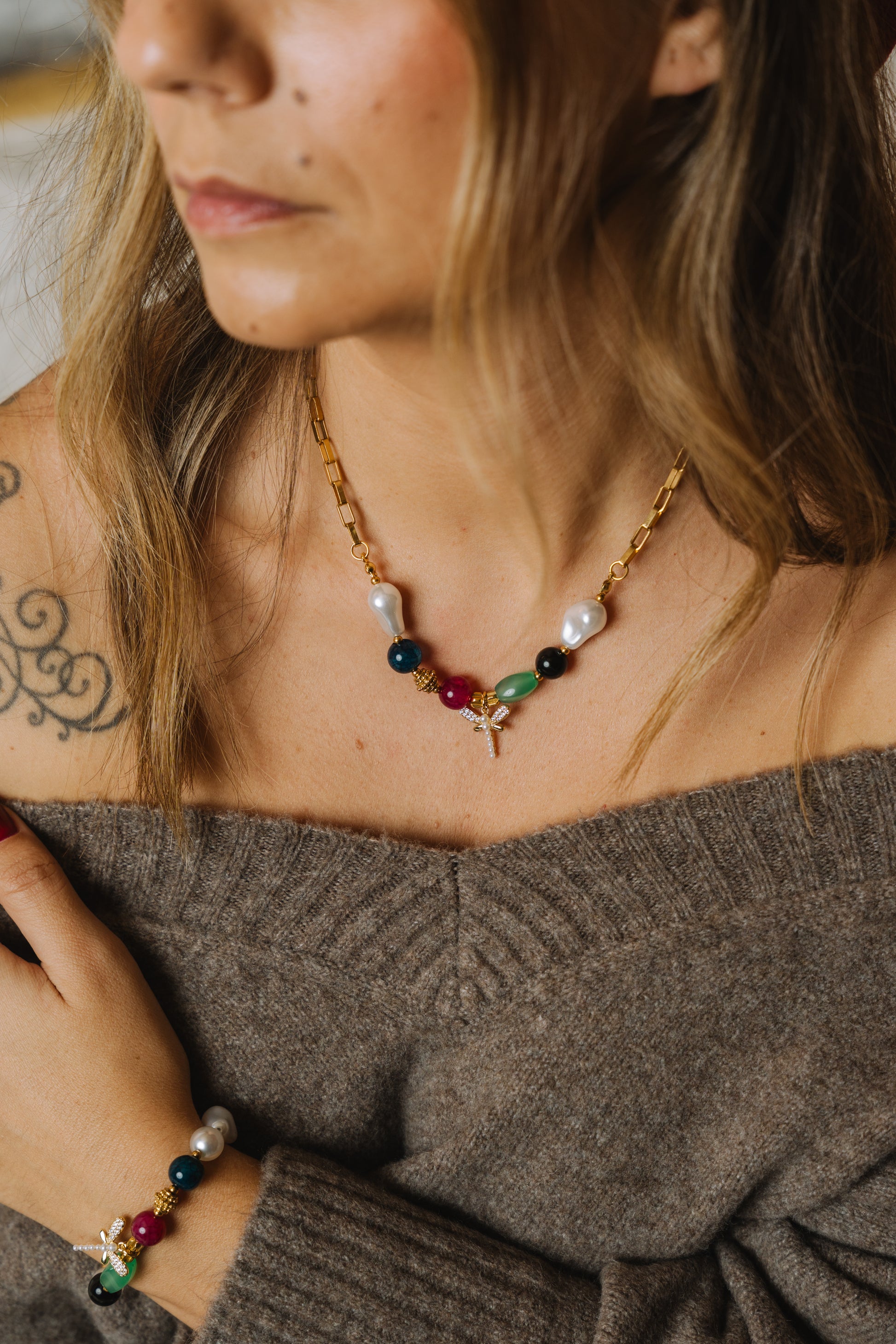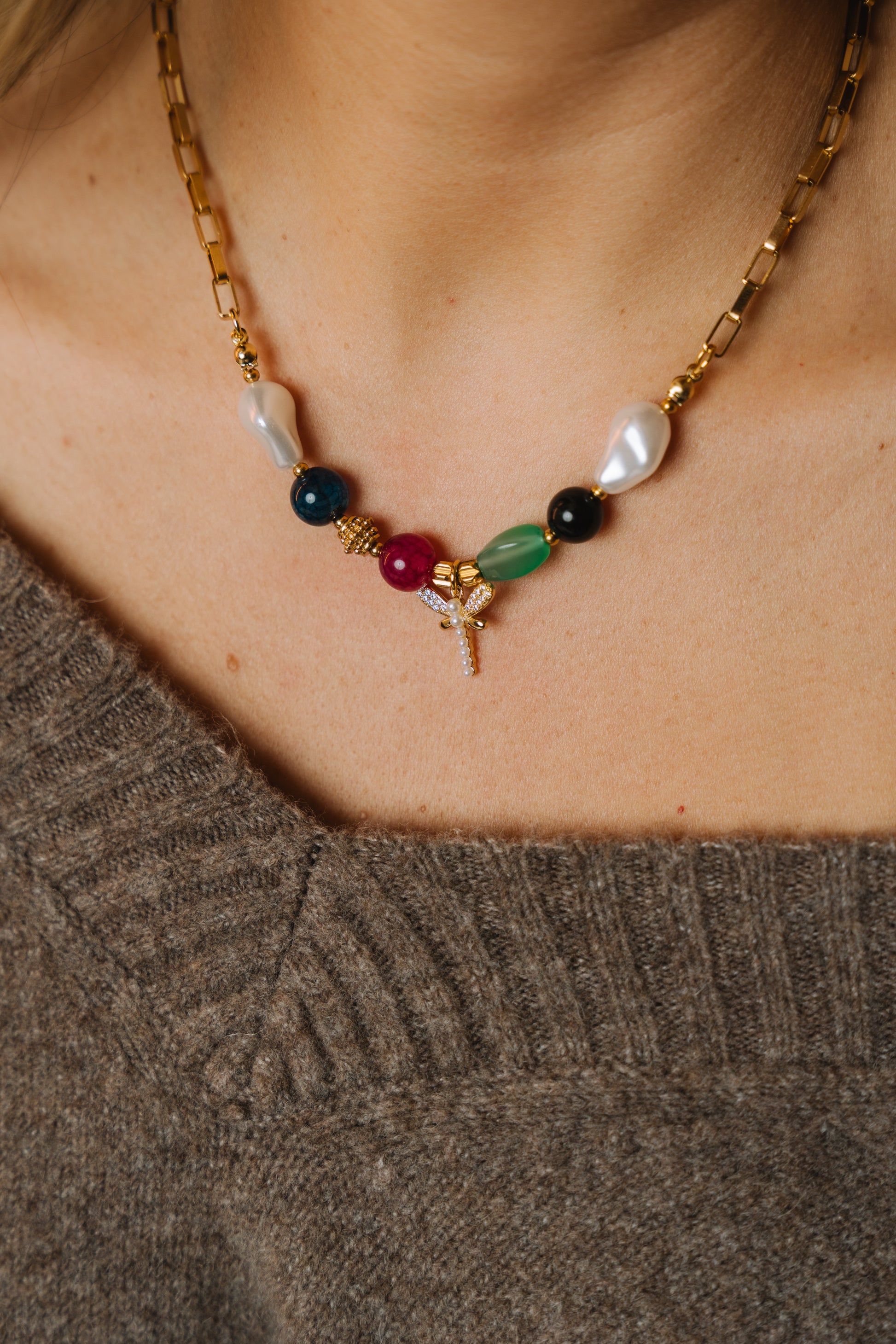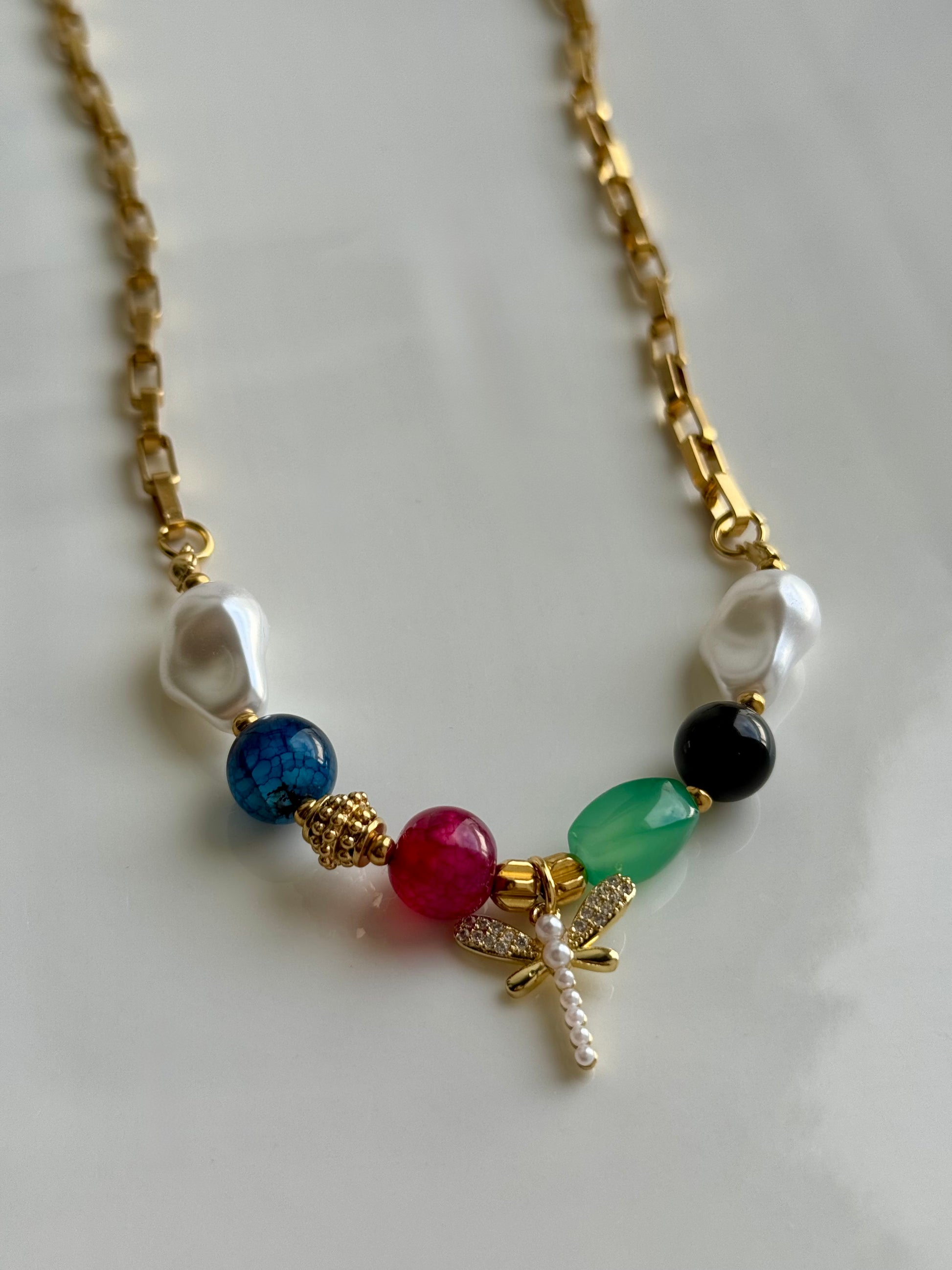 Colar em aço inoxidável, com várias pedras e libelinha delicada com pérolas, criando um mix sofisticado e encantador.