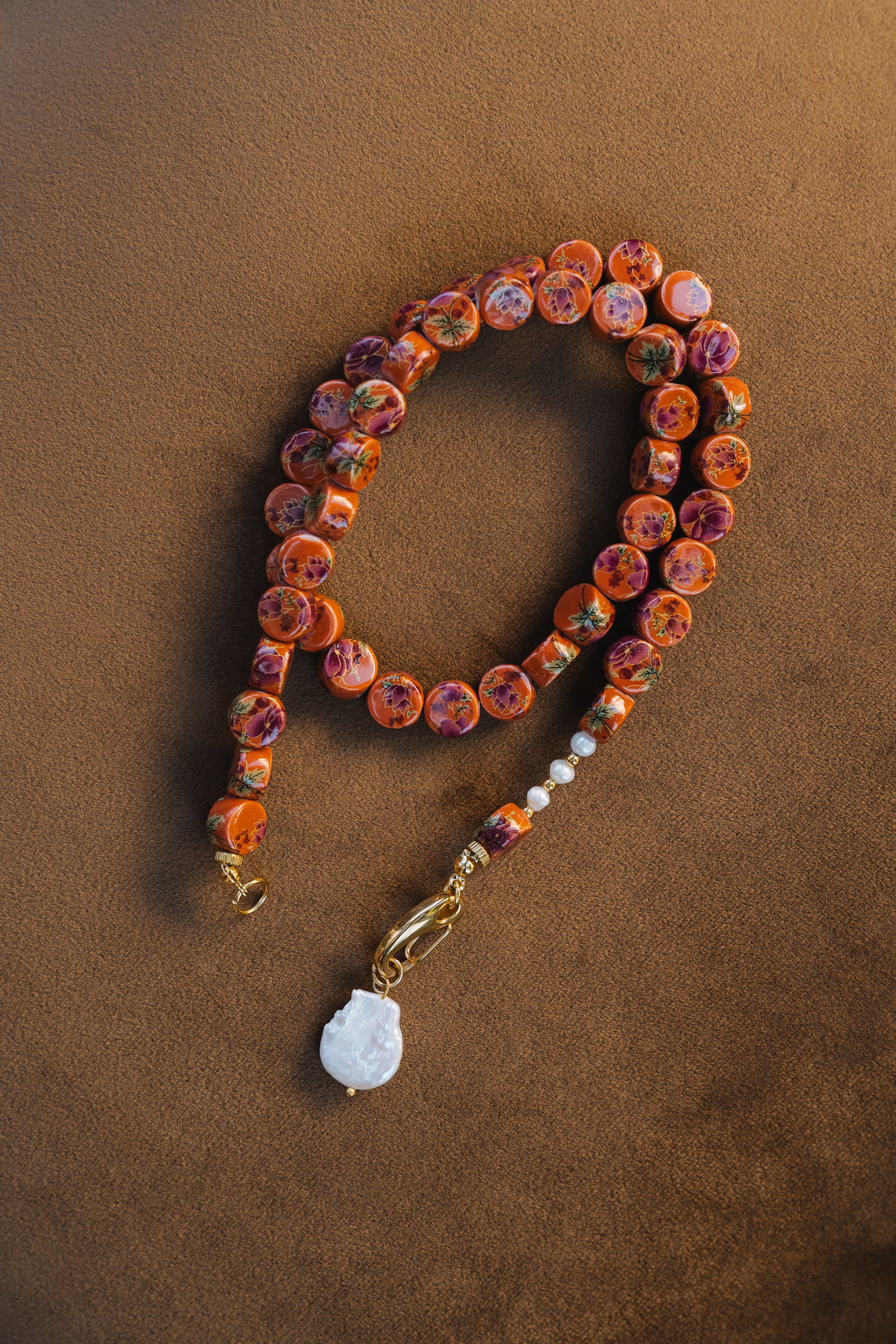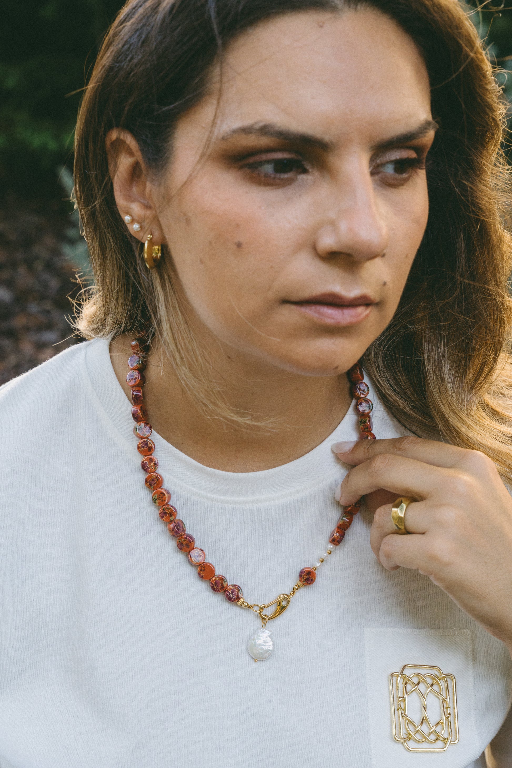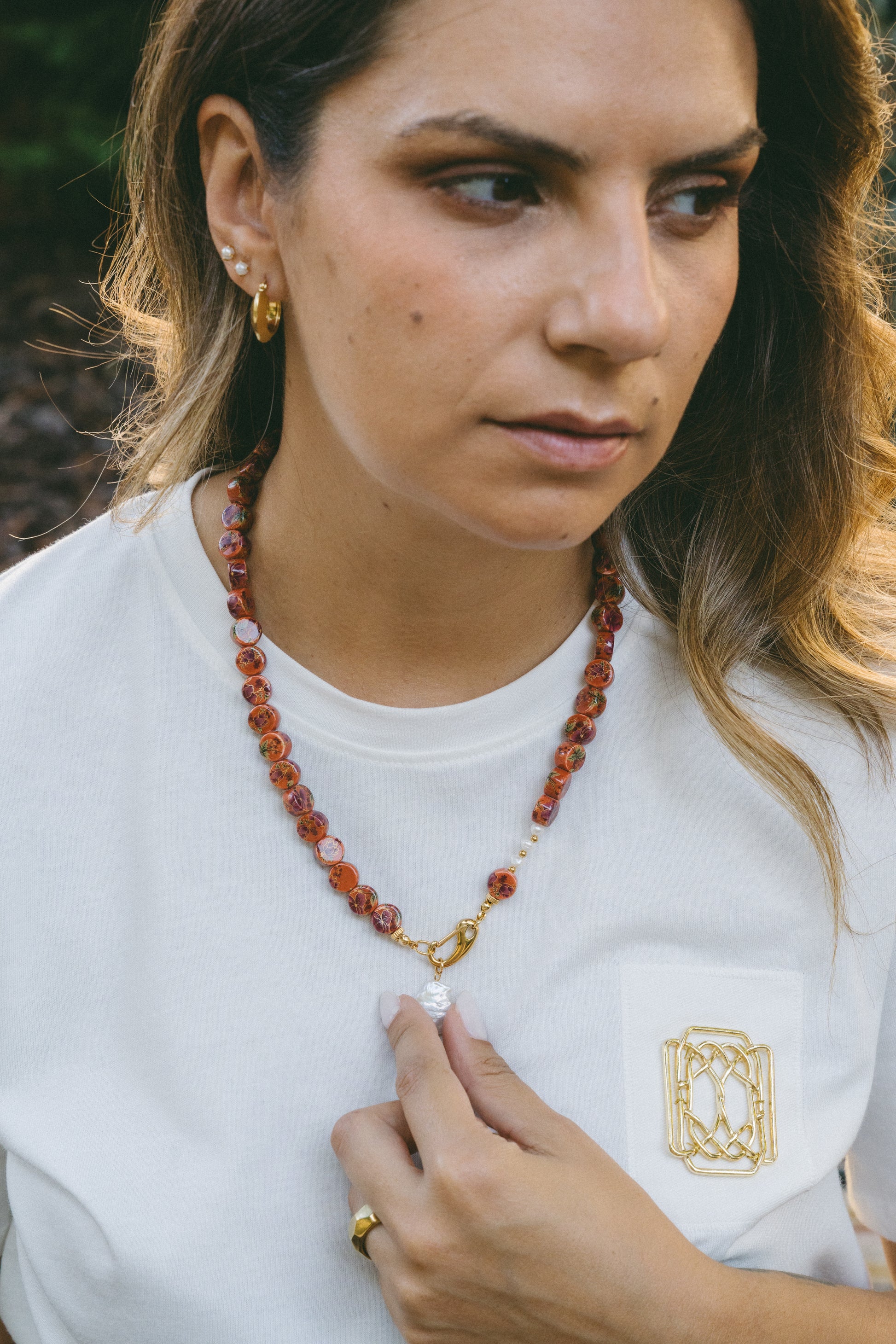 Feito com pedras pintadas em tons de terra, o colar Reflexo transmite equilíbrio e naturalidade.