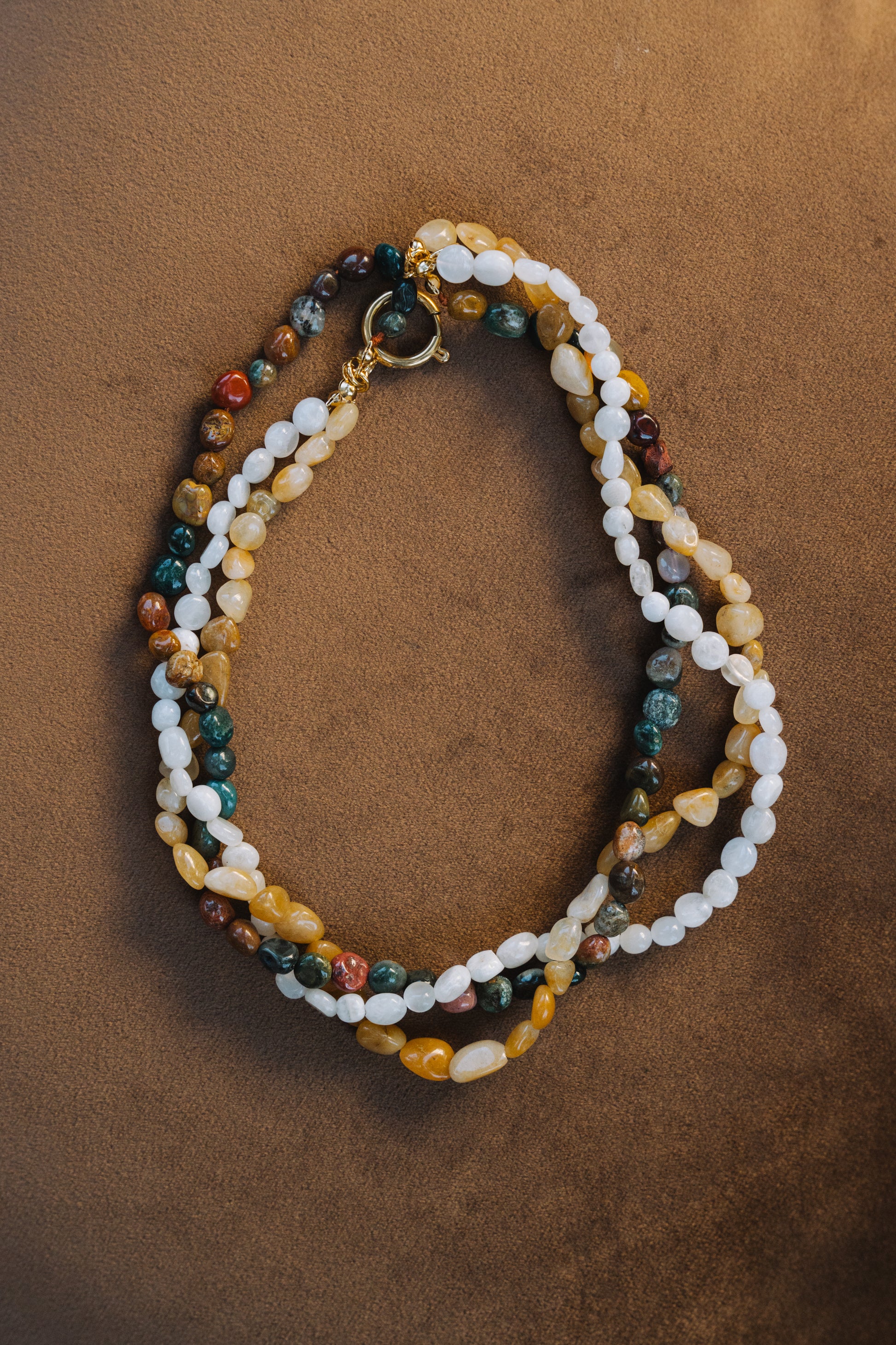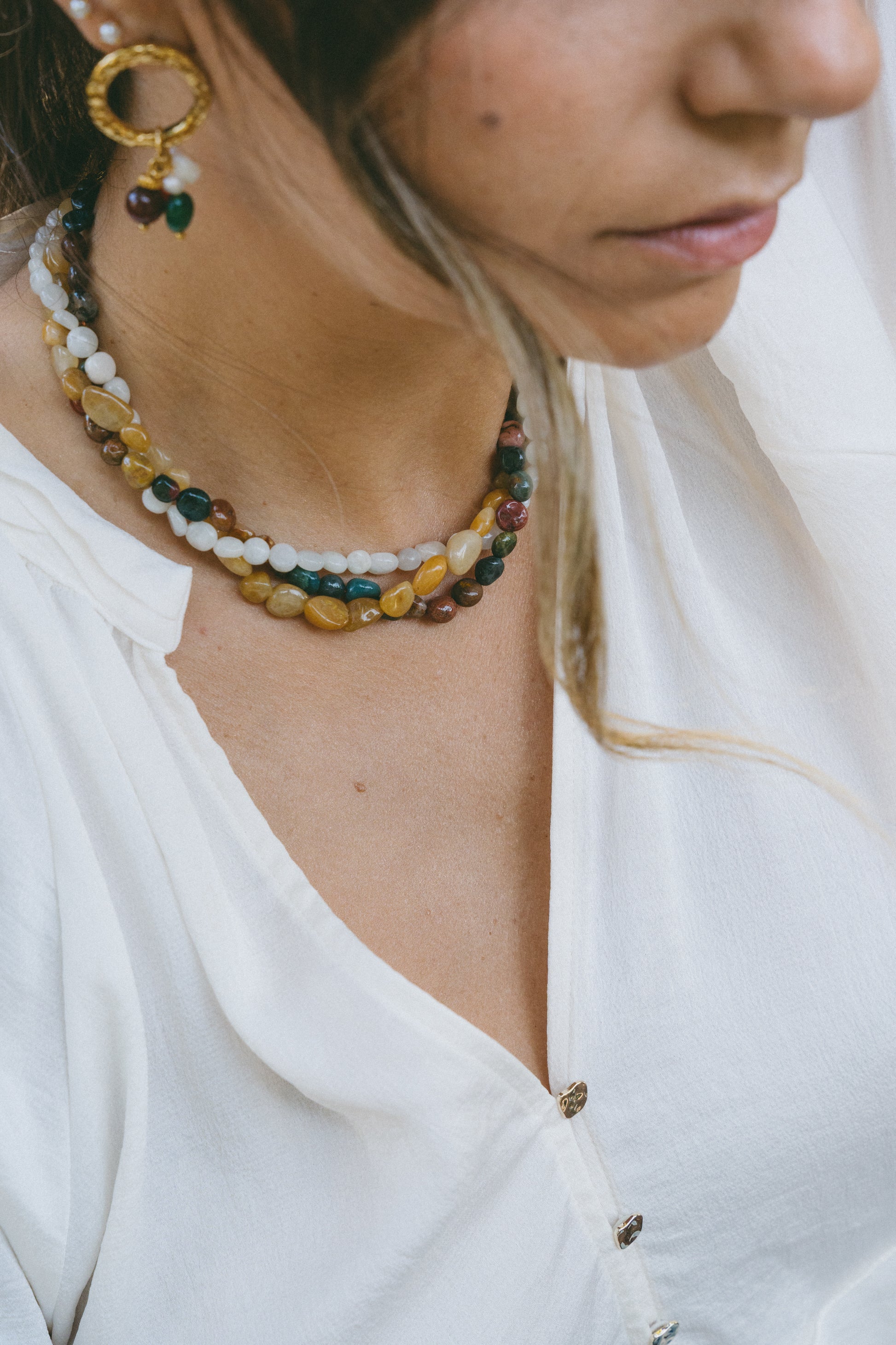 Feito com pedras naturais em tons de verde seco, bege e branco, com o fecho em aço inoxidável, garante resistência e um acabamento moderno.
