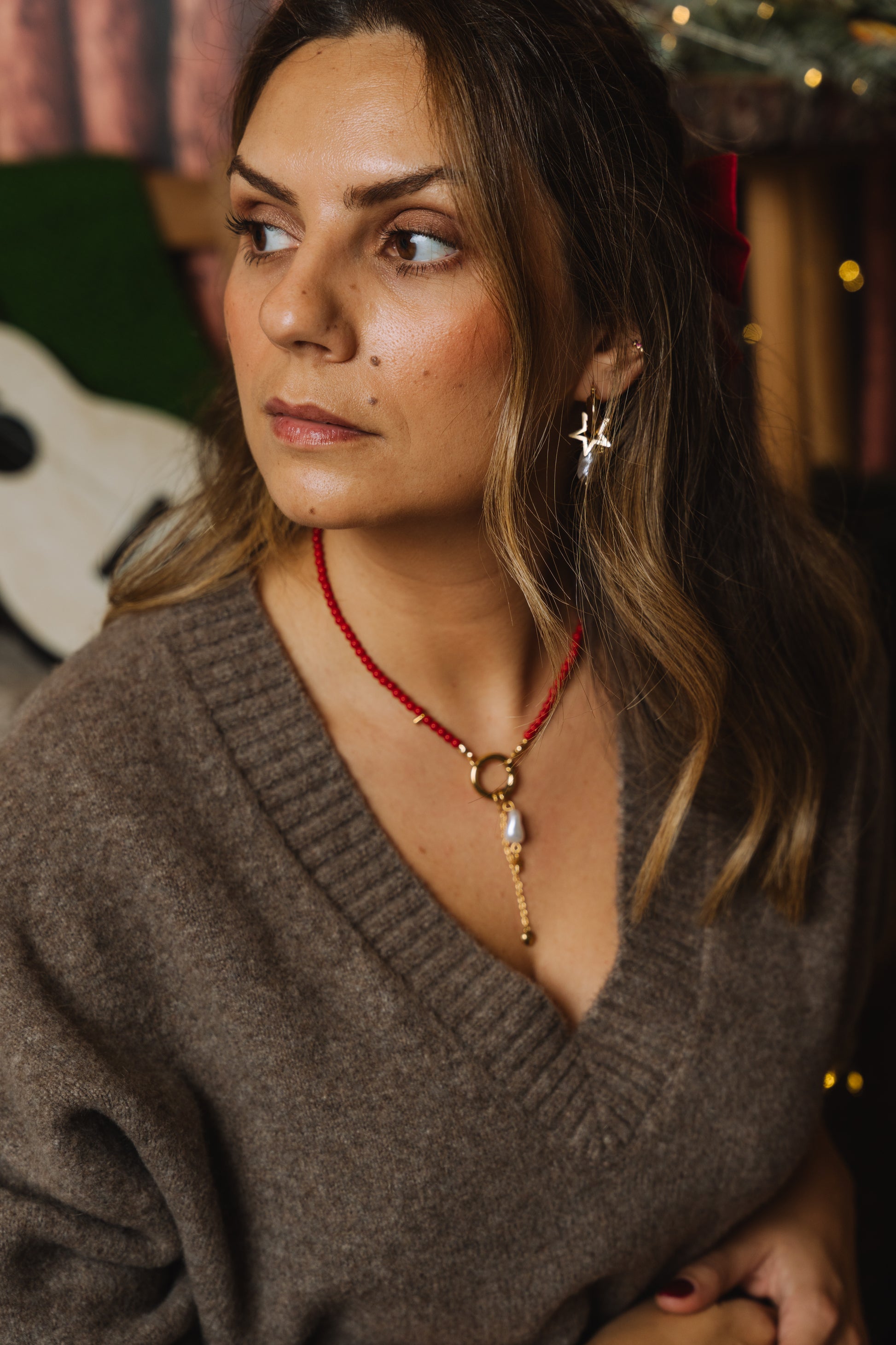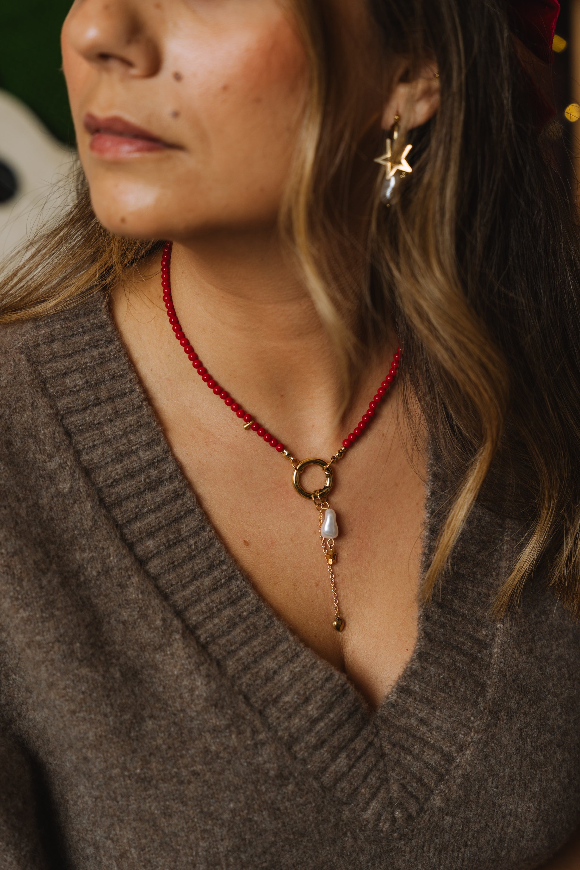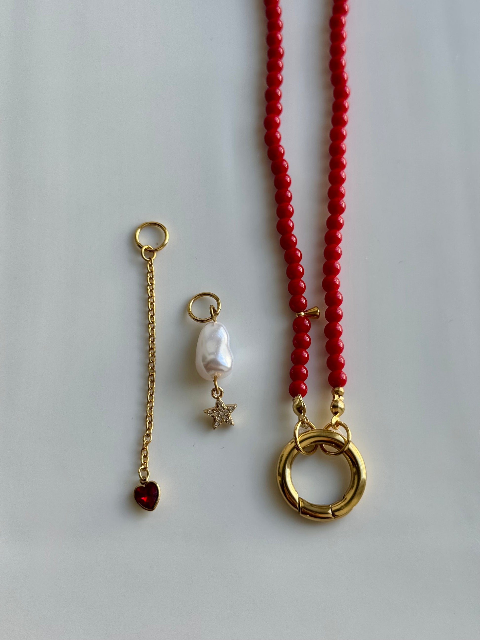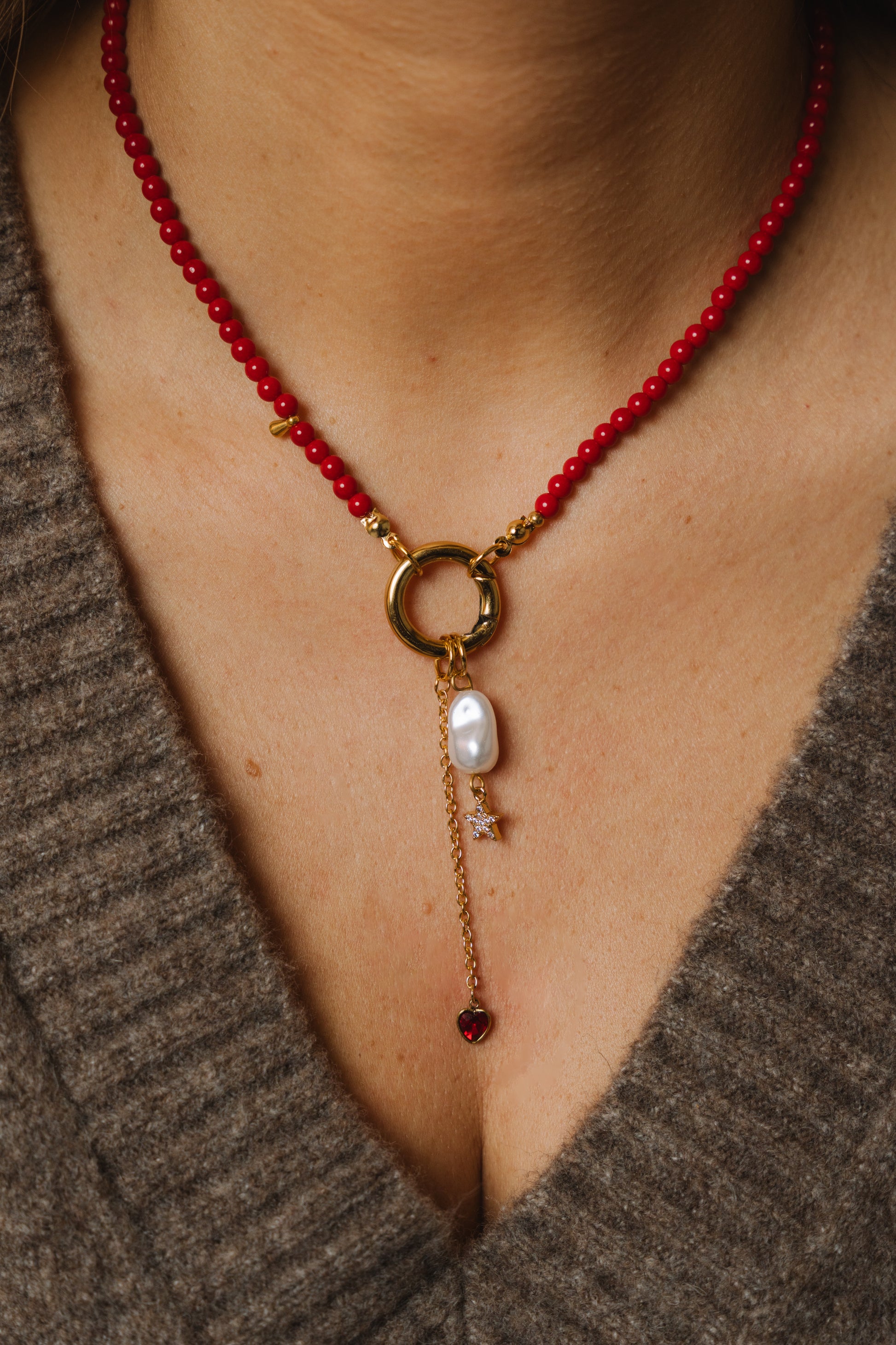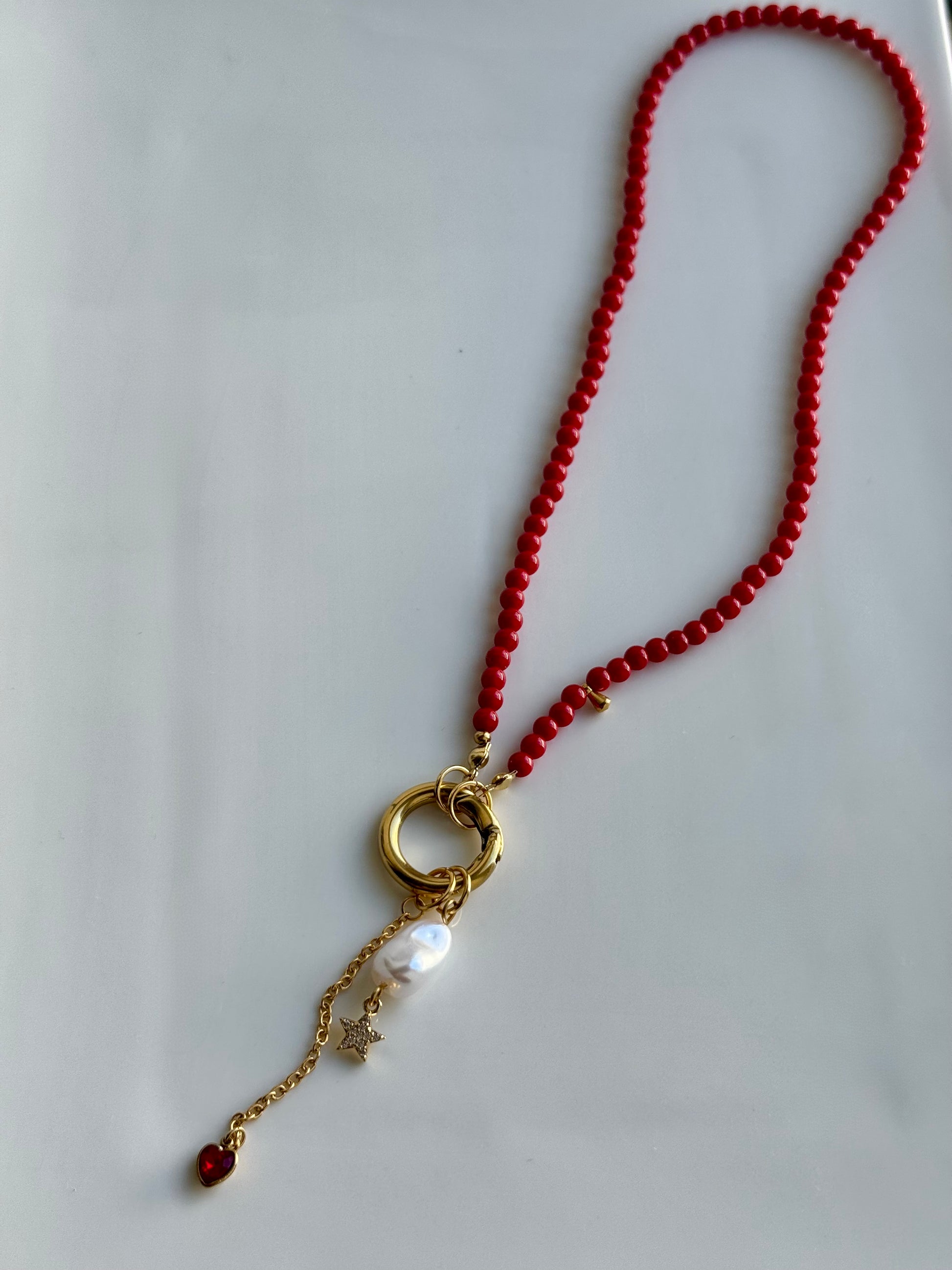 Colar em contas de pedra vermelha, com fecho em aço inoxidável e pendentes totalmente removíveis, oferecendo versatilidade e estilo.