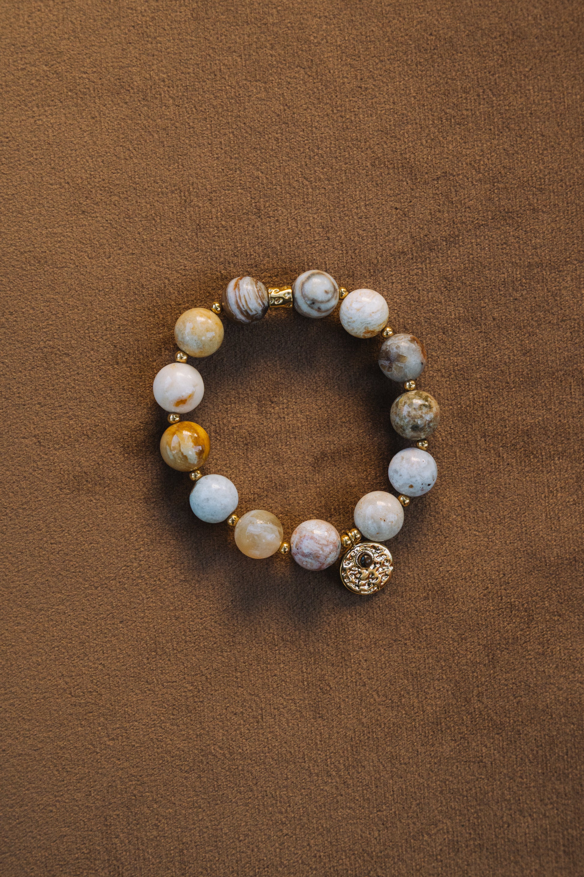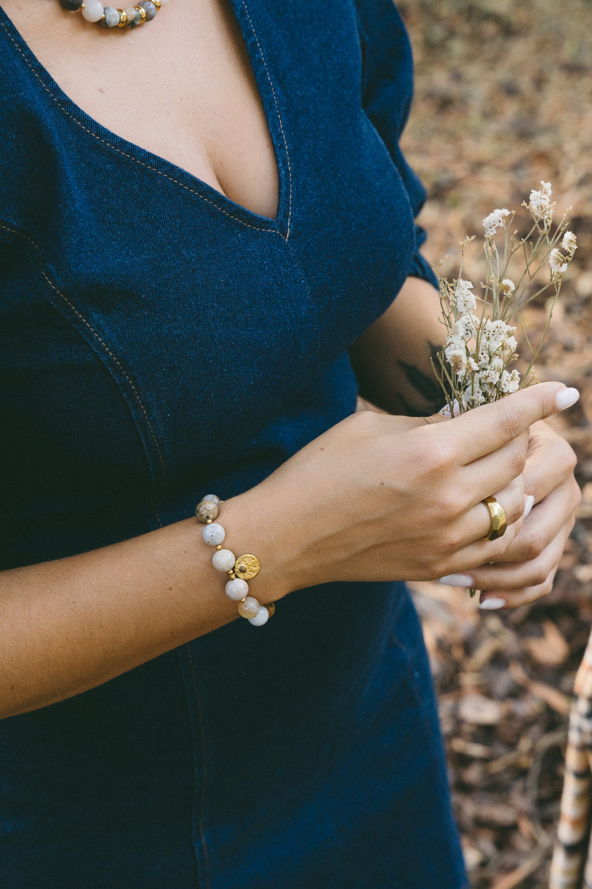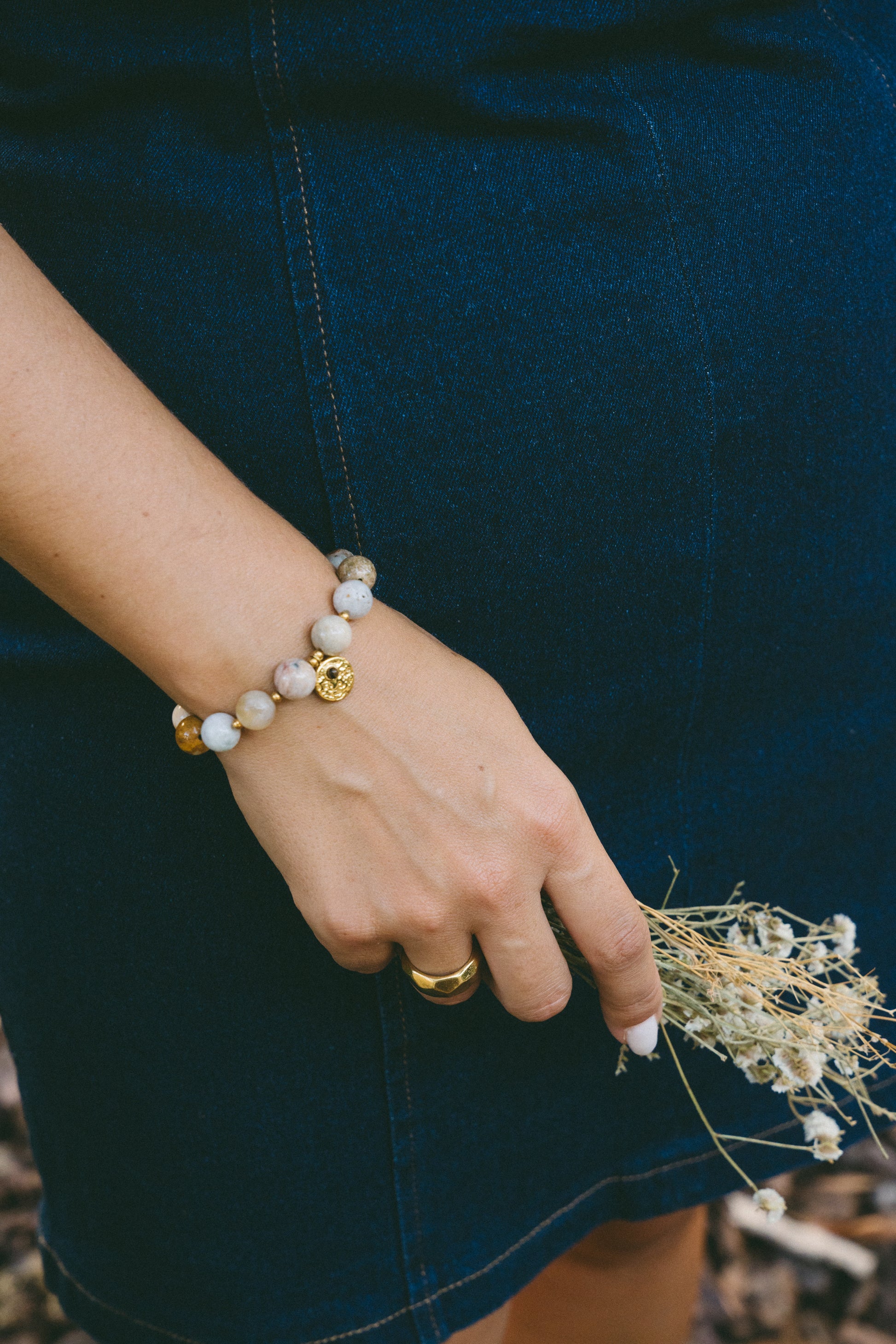 A Pulseira Respiro é uma peça com presença e carácter, feita em pedras naturais em tons de cinza e bege, combinadas com entremeios em aço inoxidável.